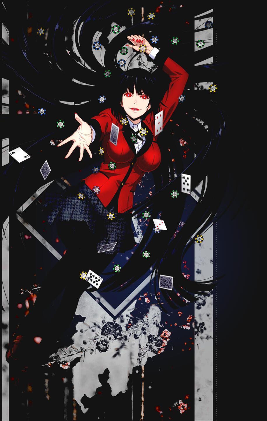 possessing the most unusual duality of a demure disposition and a sinister playfulness, jabami yumeko is characterized primarily by her high-roller, extreme personality. she appears to parse the human experience abnormally, being capable of valuing those around her yet acting brazenly nonchalant in their regards. as a result, she has been known to catalyze some manner of ruination for others as she tempts them into high-risk gambles. while there is nothing fake about her friendly demeanor, she has the uncanny ability to mean no harm while inflicting it, and feeling no remorse in doing so; this is perhaps her most noteworthy, and most unsettling, trait.yumeko understands humanity, but is incapable of empathy. her nature as a gambler renders her excessively gifted in reading other people, but her comprehension isn’t entirely dissimilar to what anyone else would glean from a textbook of any other subject. yumeko is unable to meaningfully relate to other people, and this disconnect from the human experience also lends itself to the unusual way she processes fear and anxiety – or even what can appear to be the complete absence of those ideas. this synergizes with her high-risk-high-return lifestyle, eventuating as her proclivities to compulsive gambling.yumeko is a thrill-seeker, a tendency that manifests primarily as her addiction to gambling. her favorite stakes are the highest of them; so high in fact that they often breach into the territory of the conceptual. her talent for reading people comes in handy in this regard, as she often does so for the sake of upping the ante. to yumeko, a game is too boring if something of great value isn’t in peril, which has led her to bet everything from several hundred-millions of yen, to her life, to the very concept of gambling. she seems to attribute the “fun” of a gamble to the equal risk all involved parties are put at; such is her obsession with hazardous games. yumeko’s compulsions, when she wins, often lead to massive loss for the other party, and her only admitted guilt for that is that she does not feel it.despite everything, though, yumeko is aware that she is rather “weird”, and for that reason has been shown to be genuinely surprised in the event that another person understands and plays along with her; moreover, she tends to get attached to these people. she’s also shown brief flashes of near-vulnerability when antagonized for those eccentricities, but generally takes it all stride.